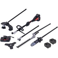Das Gerät wird mit mehreren praktischen Aufsätzen geliefert, darunter ein Rasentrimmer, ein Heckenscherenaufsatz, ein Bodenfräse-Aufsatz und eine Sägefunktion. So bietet es vielseitige Einsatzmöglichkeiten für unterschiedliche Gartenarbeiten.